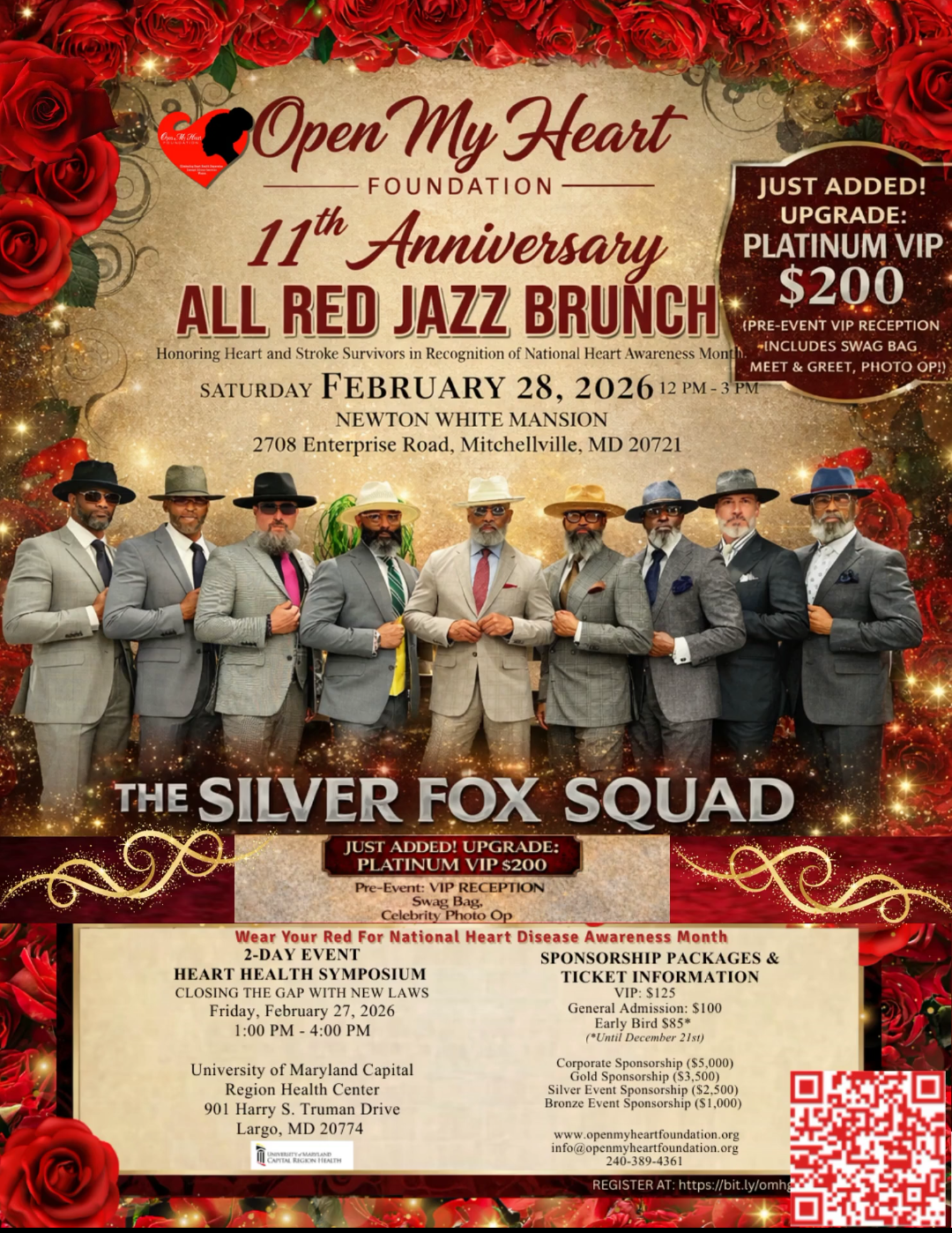 Celebrate the 11th Anniversary of the Open My Heart Foundation honoring heart & stroke survivors during National Heart Awareness Month at our “All Red Jazz Brunch.” Hosted by Marissa Mitchell with Musical Guests Maysa and Merlon Devine.