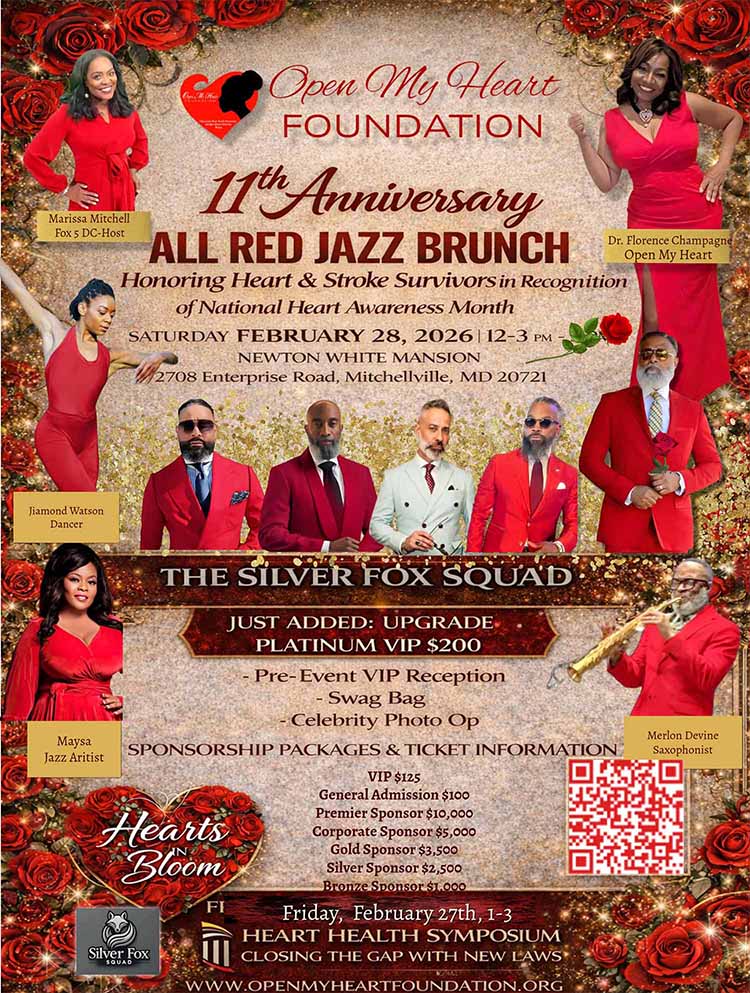 Join us at our 11th Anniversary All Red Jazz Brunch, as we honor heart and stroke survivors, and those who are making a difference in the heart health community. We are working with local hospitals and our goal is to raise $30,000. Proceeds will benefit heart and stroke patients.